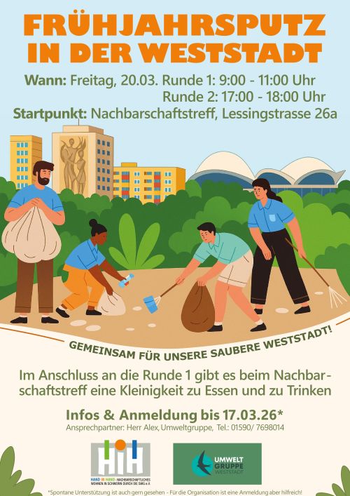 In der dritten Märzwoche findet der alljährliche Frühjahrsputz in Schwerin statt. Auch in der Weststadt soll am Freitag, den 20.03. der Müll fleißig gesammelt und entsorgt werden.