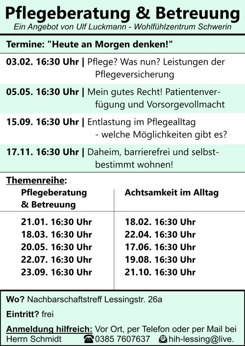 Der Pflegeberater Ulf Luckmann informiert auch in diesem Jahr zu verschiedenen Aspekten rund um die Themen Pflegeberatung und Betreuung sowie Achtsamkeit im Alltag.