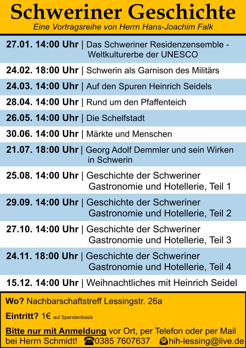 Jeden letzten Dienstag im Monat hält Herr Hans-Joachim Falk einen Vortrag zur Schweriner Geschichte. Tauchen Sie ein in die vergangene Zeit und lauschen Sie den faszinierenden Geschichten zu der Stadt, ihrer Entwicklung, Gebäuden und Persönlichkeiten. Die Vorträge finden im Nachbarschaftstreff "Nebenan" Lessingstr. 26a in der Weststadt statt. Die Genauen Termine und Uhrzeiten entnehmen Sie den Bild.